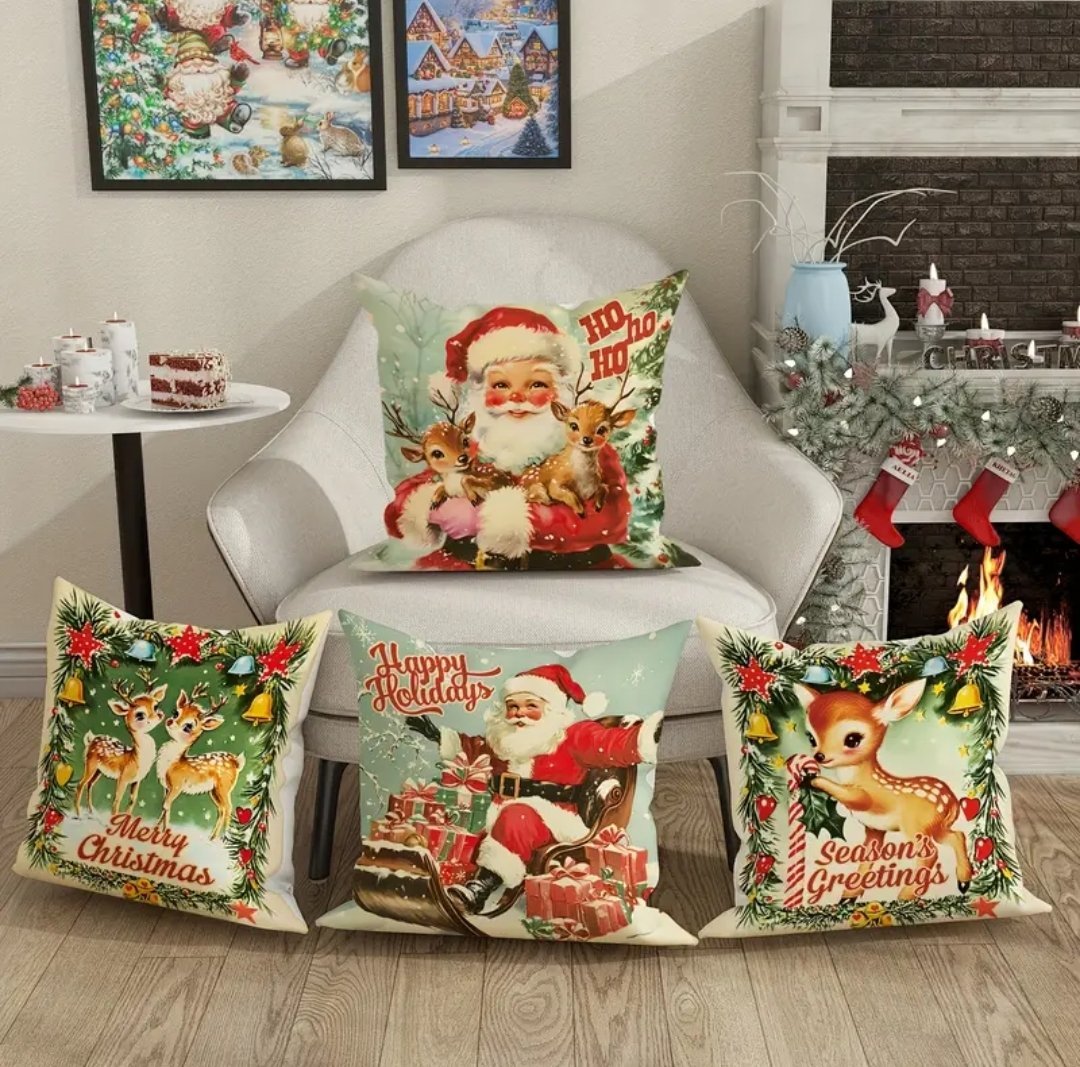 ✨ Descripción del producto – Fundas Navideñas x4 🎁 Set de 4 fundas decorativas estilo vintage, ideales para añadir un toque nostálgico y encantador a tu decoración navideña. 📏 Medidas: 45 cm x 45 cm cada funda 📦 Cantidad: 4 unidades 🎨 Diseño: Inspiración retro con ilustraciones clásicas navideñas como muñecos de nieve, personajes infantiles, regalos, árboles festivos y detalles que simulan un efecto envejecido tipo papel antiguo. 🏡 Uso: Perfectas para decorar sofás, sillones, camas, rincones especiales o complementar cualquier ambiente con temática navideña. Aportan un estilo cálido, tradicional y lleno de encanto. 🎄 Un set ideal para quienes aman la Navidad con un aire clásico y vintage, transformando cualquier espacio en un ambiente acogedor y festivo.